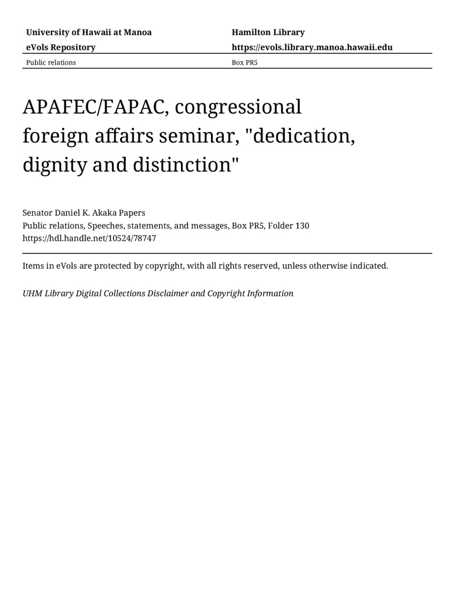 - APAFEC/FAPAC, congressional foreign affairs seminar, "dedication, dignity and distinction"