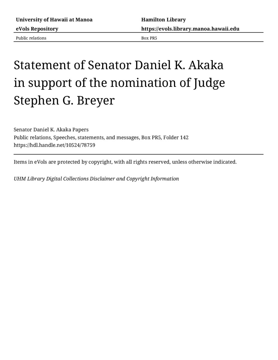 - Statement of Senator Daniel K. Akaka in support of the nomination of Judge Stephen G. Breyer