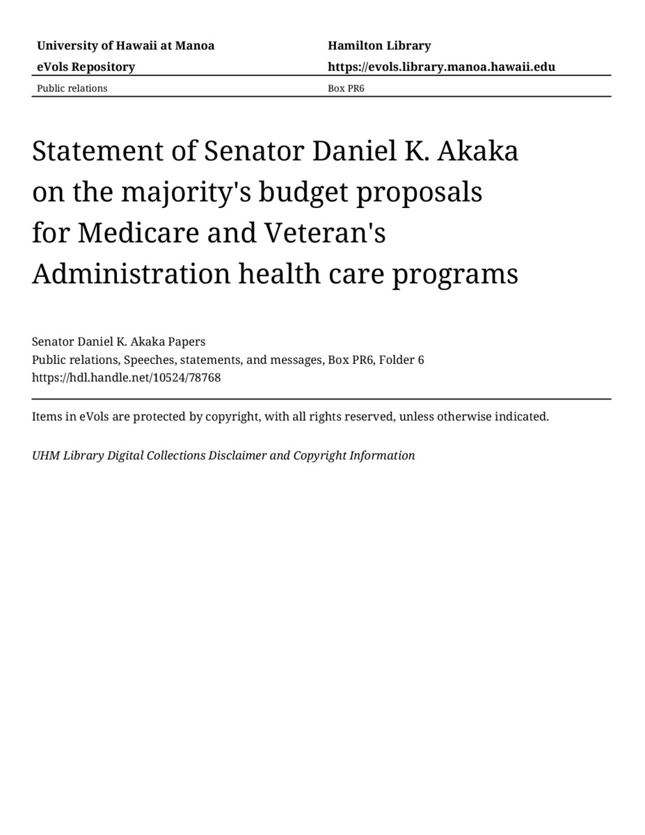 Statement of Senator Daniel K. Akaka on the majority's budget proposals for Medicare and Veteran's Administration health care programs, May 18, 1995, MANUSCRIPT-HCPC00010, Public relations, Speeches, statements, and messages, Box PR6, Folder 6, Senator Daniel K. Akaka Papers, Hawaiʻi Congressional Papers Collection, University of Hawaiʻi at Mānoa Library, Honolulu, HI. https://omekas-congress.lib.wvu.edu/catalog/10524_78768 (accessed April 17, 2026).