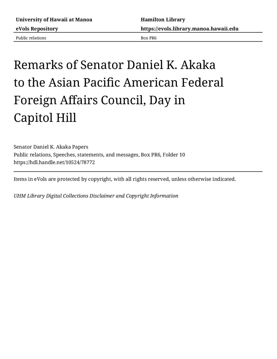 Remarks of Senator Daniel K. Akaka to the Asian Pacific American Federal Foreign Affairs Council, Day in Capitol Hill, November 2, 1995, MANUSCRIPT-HCPC00010, Public relations, Speeches, statements, and messages, Box PR6, Folder 10, Senator Daniel K. Akaka Papers, Hawaiʻi Congressional Papers Collection, University of Hawaiʻi at Mānoa Library, Honolulu, HI. https://omekas-congress.lib.wvu.edu/catalog/10524_78772 (accessed April 17, 2026).