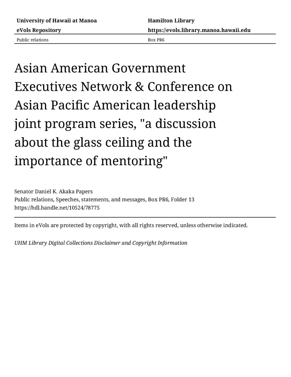 Asian American Government Executives Network & Conference on Asian Pacific American leadership joint program series, "a discussion about the glass ceiling and the importance of mentoring", April 24, 1996, MANUSCRIPT-HCPC00010, Public relations, Speeches, statements, and messages, Box PR6, Folder 13, Senator Daniel K. Akaka Papers, Hawaiʻi Congressional Papers Collection, University of Hawaiʻi at Mānoa Library, Honolulu, HI. https://omekas-congress.lib.wvu.edu/catalog/10524_78775 (accessed April 19, 2026).