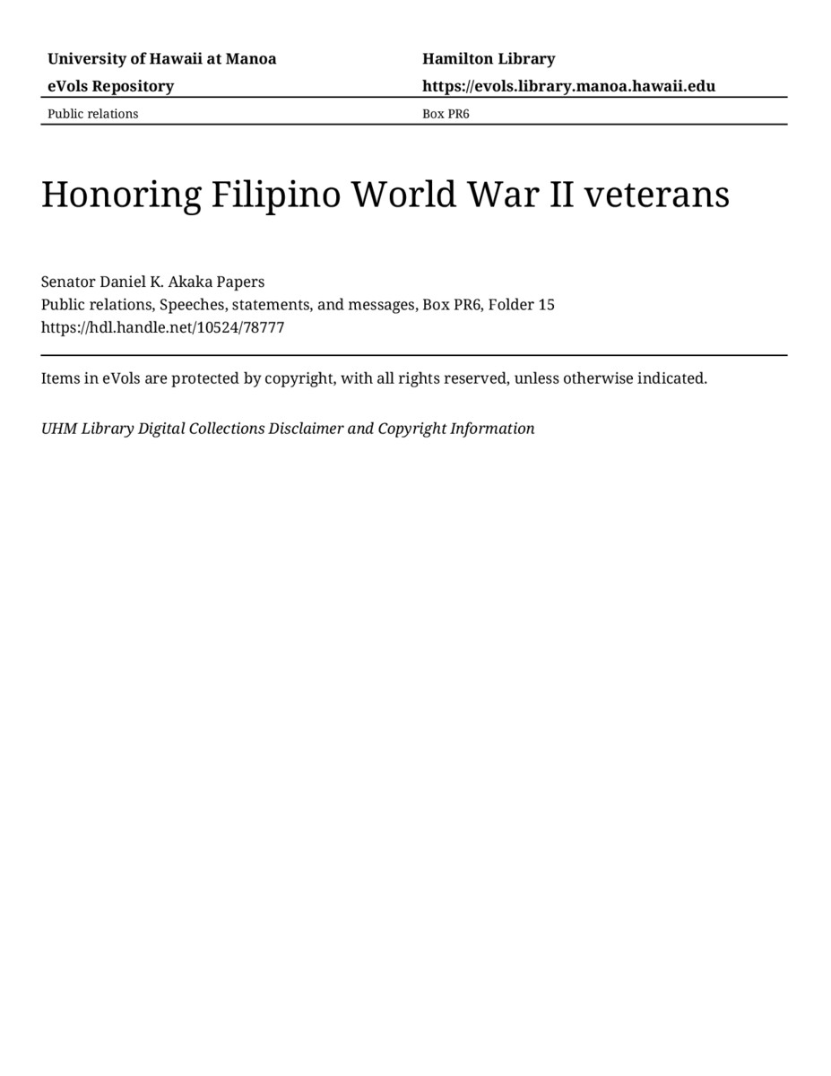 Honoring Filipino World War II veterans, June 13, 1996, MANUSCRIPT-HCPC00010, Public relations, Speeches, statements, and messages, Box PR6, Folder 15, Senator Daniel K. Akaka Papers, Hawaiʻi Congressional Papers Collection, University of Hawaiʻi at Mānoa Library, Honolulu, HI. https://omekas-congress.lib.wvu.edu/catalog/10524_78777 (accessed April 19, 2026).