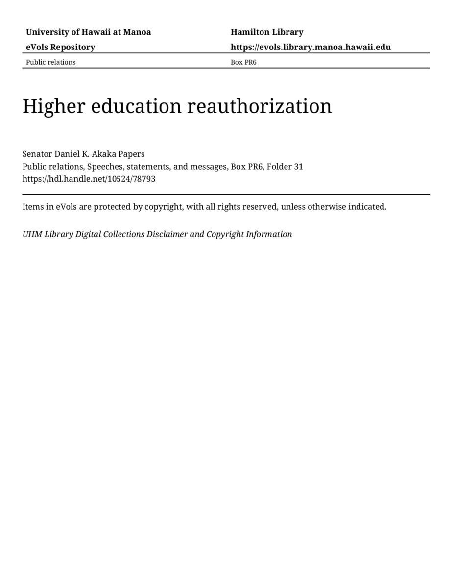 Higher education reauthorization, approximately 1998, MANUSCRIPT-HCPC00010, Public relations, Speeches, statements, and messages, Box PR6, Folder 31, Senator Daniel K. Akaka Papers, Hawaiʻi Congressional Papers Collection, University of Hawaiʻi at Mānoa Library, Honolulu, HI. https://omekas-congress.lib.wvu.edu/catalog/10524_78793 (accessed April 17, 2026).