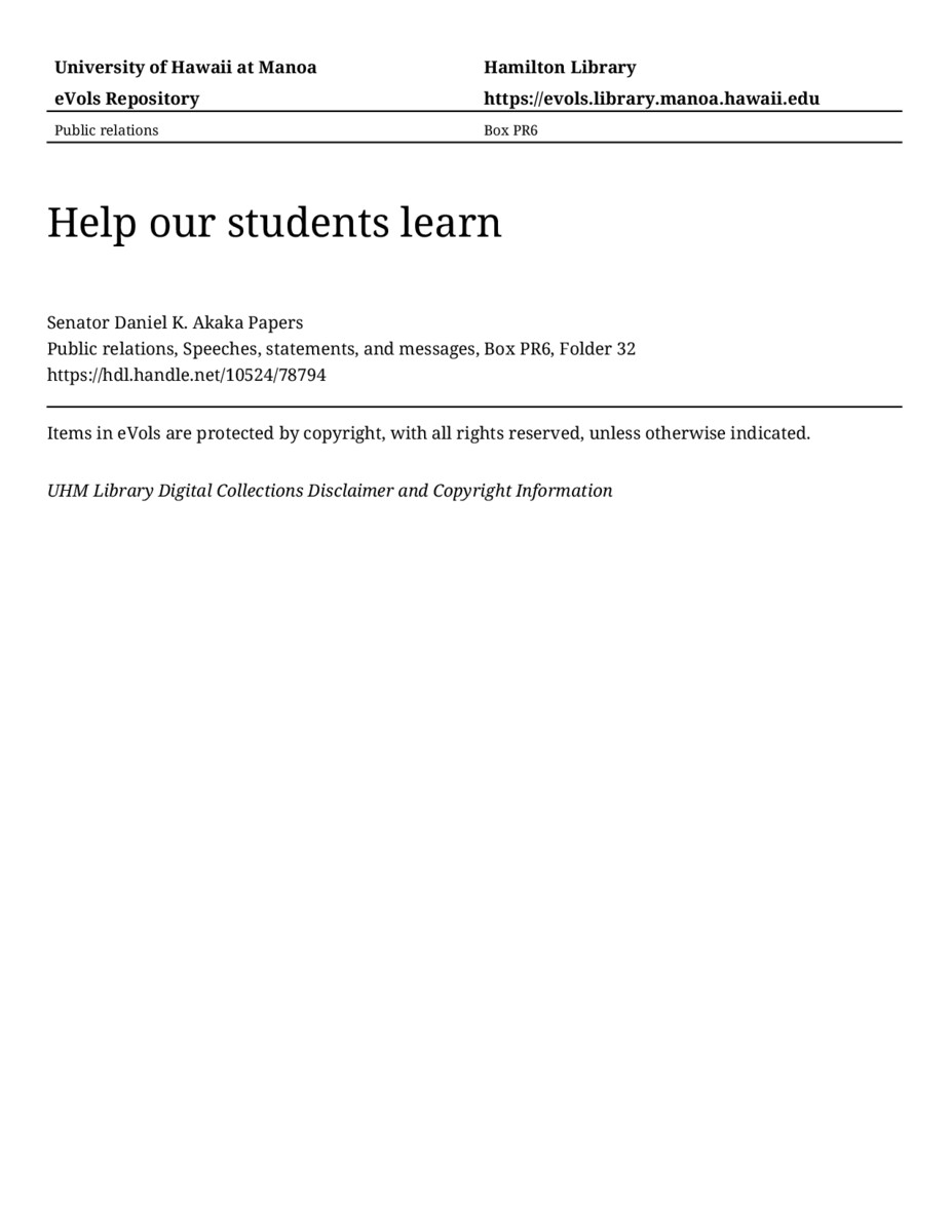 Help our students learn, approximately 1998, MANUSCRIPT-HCPC00010, Public relations, Speeches, statements, and messages, Box PR6, Folder 32, Senator Daniel K. Akaka Papers, Hawaiʻi Congressional Papers Collection, University of Hawaiʻi at Mānoa Library, Honolulu, HI. https://omekas-congress.lib.wvu.edu/catalog/10524_78794 (accessed April 17, 2026).