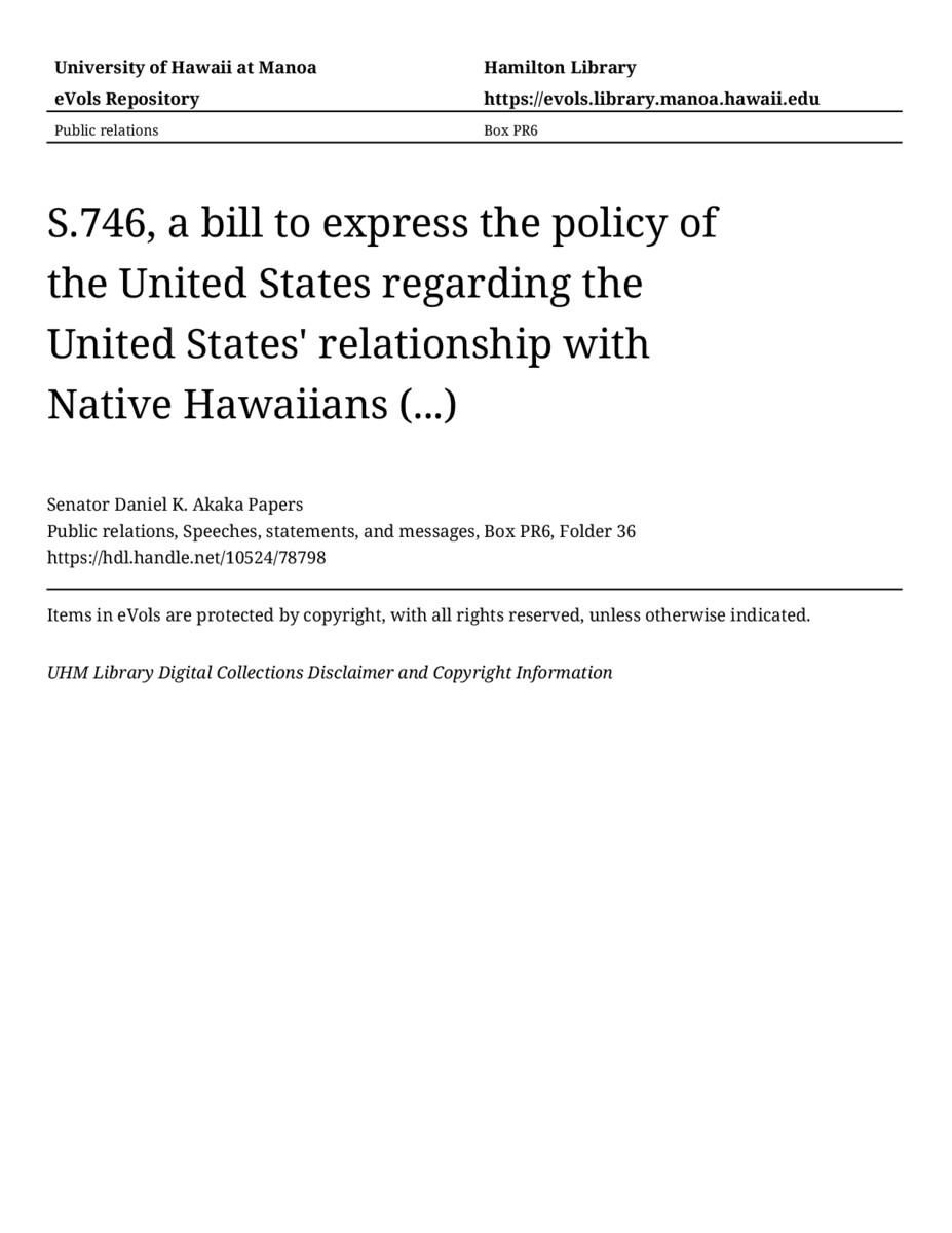 S.746, a bill to express the policy of the United States regarding the United States' relationship with Native Hawaiians (...), April 6, 2001, MANUSCRIPT-HCPC00010, Public relations, Speeches, statements, and messages, Box PR6, Folder 36, Senator Daniel K. Akaka Papers, Hawaiʻi Congressional Papers Collection, University of Hawaiʻi at Mānoa Library, Honolulu, HI. https://omekas-congress.lib.wvu.edu/catalog/10524_78798 (accessed April 12, 2026).