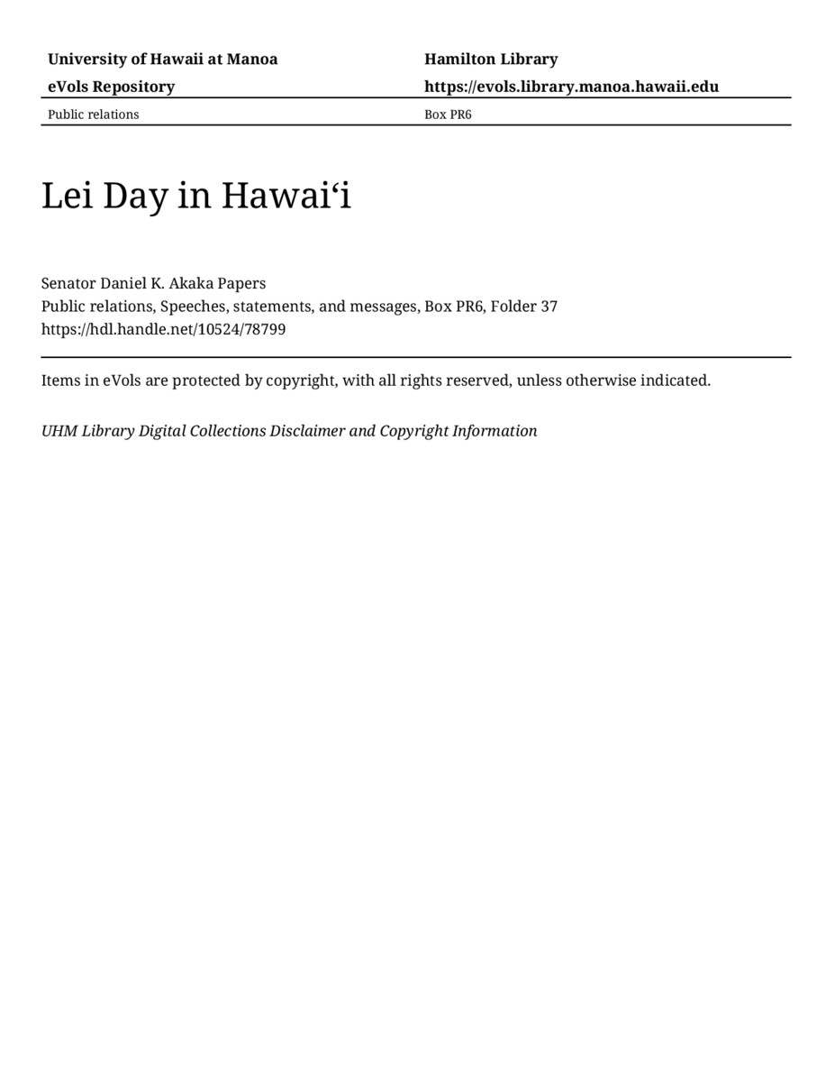 Lei Day in Hawaiʻi, May 1, 2001, MANUSCRIPT-HCPC00010, Public relations, Speeches, statements, and messages, Box PR6, Folder 37, Senator Daniel K. Akaka Papers, Hawaiʻi Congressional Papers Collection, University of Hawaiʻi at Mānoa Library, Honolulu, HI. https://omekas-congress.lib.wvu.edu/catalog/10524_78799 (accessed April 12, 2026).