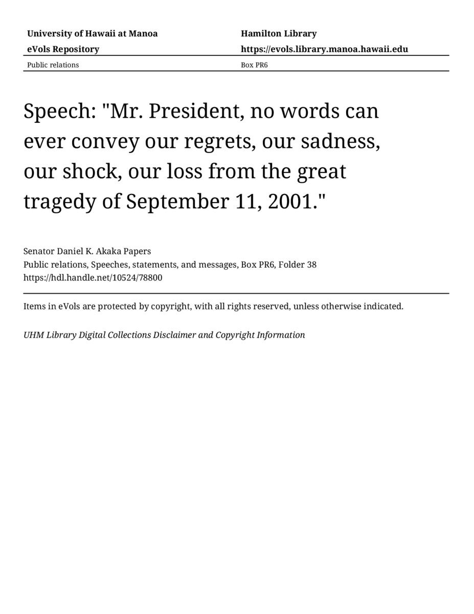 Speech: "Mr. President, no words can ever convey our regrets, our sadness, our shock, our loss from the great tragedy of September 11, 2001.", September 12, 2001, MANUSCRIPT-HCPC00010, Public relations, Speeches, statements, and messages, Box PR6, Folder 38, Senator Daniel K. Akaka Papers, Hawaiʻi Congressional Papers Collection, University of Hawaiʻi at Mānoa Library, Honolulu, HI. https://omekas-congress.lib.wvu.edu/catalog/10524_78800 (accessed April 17, 2026).