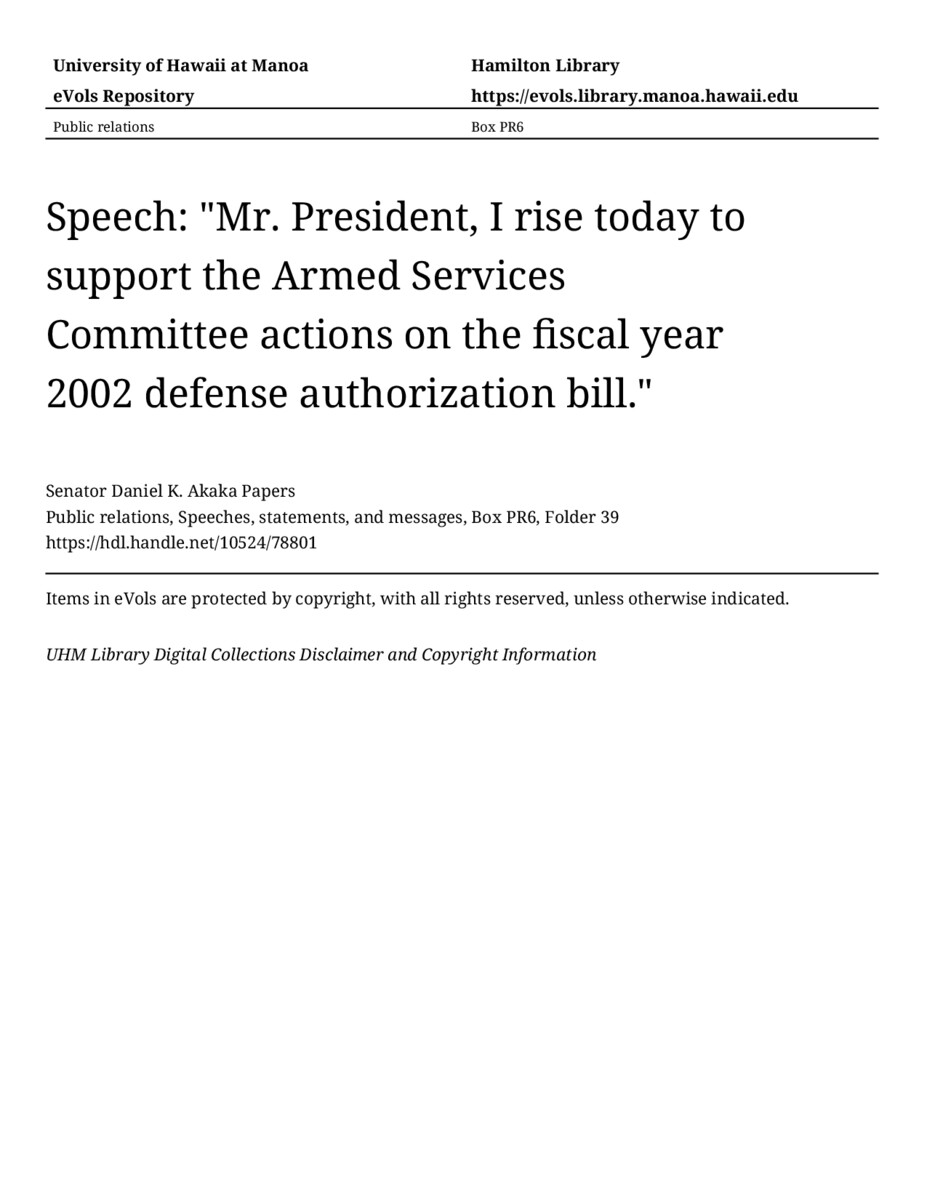 Speech: "Mr. President, I rise today to support the Armed Services Committee actions on the fiscal year 2002 defense authorization bill.", September 21, 2001, MANUSCRIPT-HCPC00010, Public relations, Speeches, statements, and messages, Box PR6, Folder 39, Senator Daniel K. Akaka Papers, Hawaiʻi Congressional Papers Collection, University of Hawaiʻi at Mānoa Library, Honolulu, HI. https://omekas-congress.lib.wvu.edu/catalog/10524_78801 (accessed April 17, 2026).
