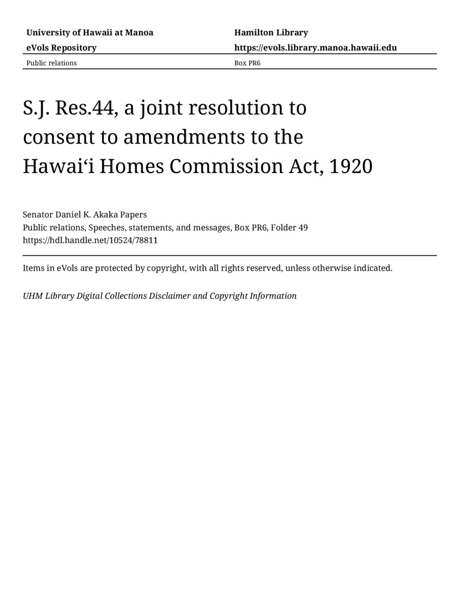 S.J. Res.44, a joint resolution to consent to amendments to the Hawaiʻi Homes Commission Act, 1920