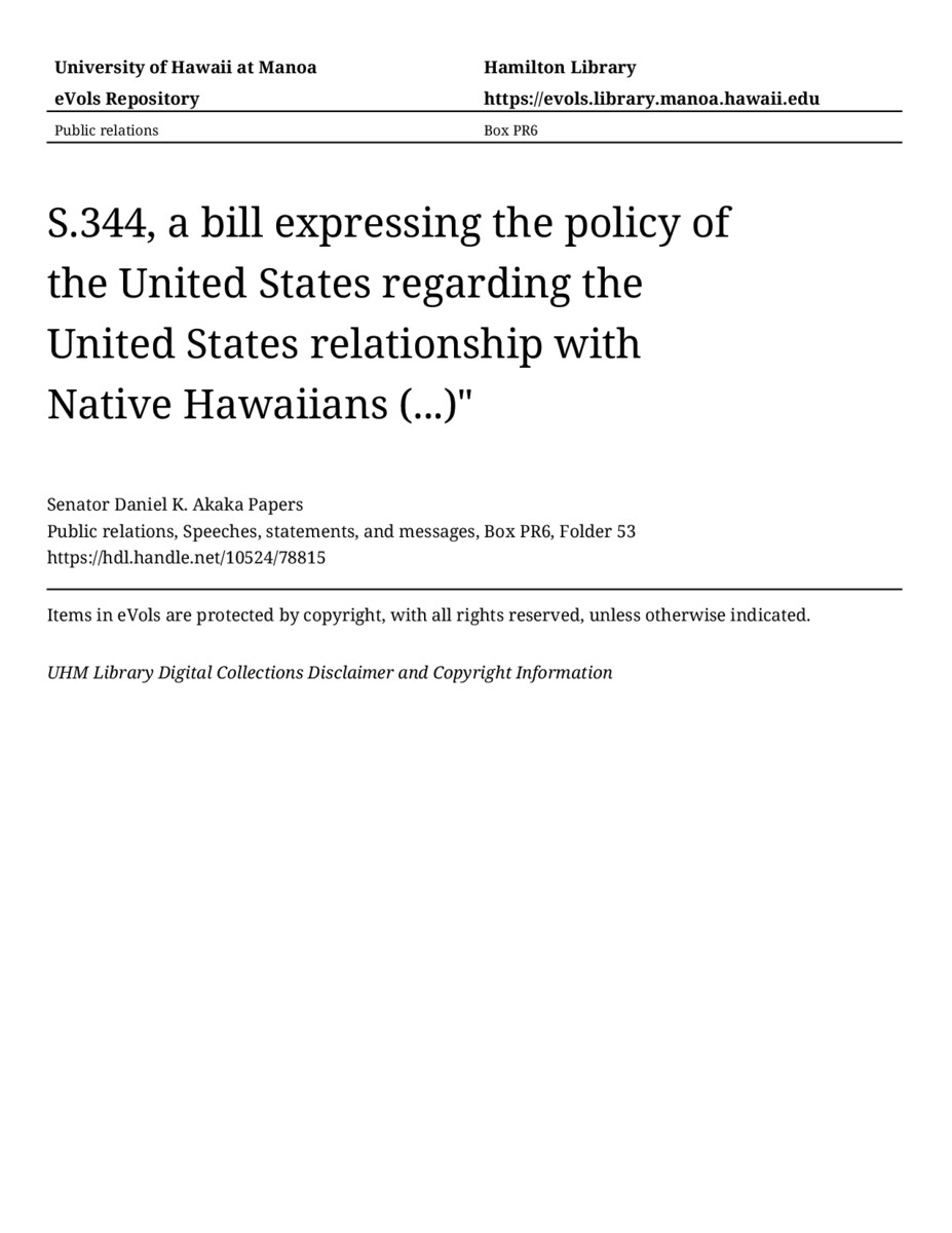 S.344, a bill expressing the policy of the United States regarding the United States relationship with Native Hawaiians (...)", February 11, 2003, MANUSCRIPT-HCPC00010, Public relations, Speeches, statements, and messages, Box PR6, Folder 53, Senator Daniel K. Akaka Papers, Hawaiʻi Congressional Papers Collection, University of Hawaiʻi at Mānoa Library, Honolulu, HI. https://omekas-congress.lib.wvu.edu/catalog/10524_78815 (accessed April 12, 2026).