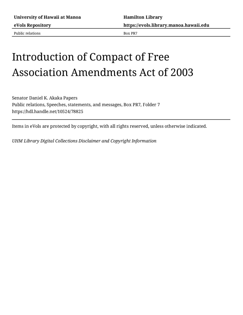 - Introduction of Compact of Free Association Amendments Act of 2003