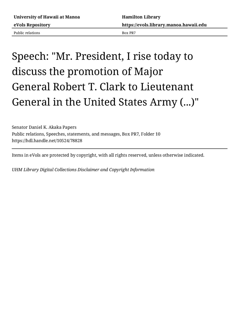Speech: "Mr. President, I rise today to discuss the promotion of Major General Robert T. Clark to Lieutenant General in the United States Army (...)", November 18, 2003, MANUSCRIPT-HCPC00010, Public relations, Speeches, statements, and messages, Box PR7, Folder 10, Senator Daniel K. Akaka Papers, Hawaiʻi Congressional Papers Collection, University of Hawaiʻi at Mānoa Library, Honolulu, HI. https://omekas-congress.lib.wvu.edu/catalog/10524_78828 (accessed April 17, 2026).
