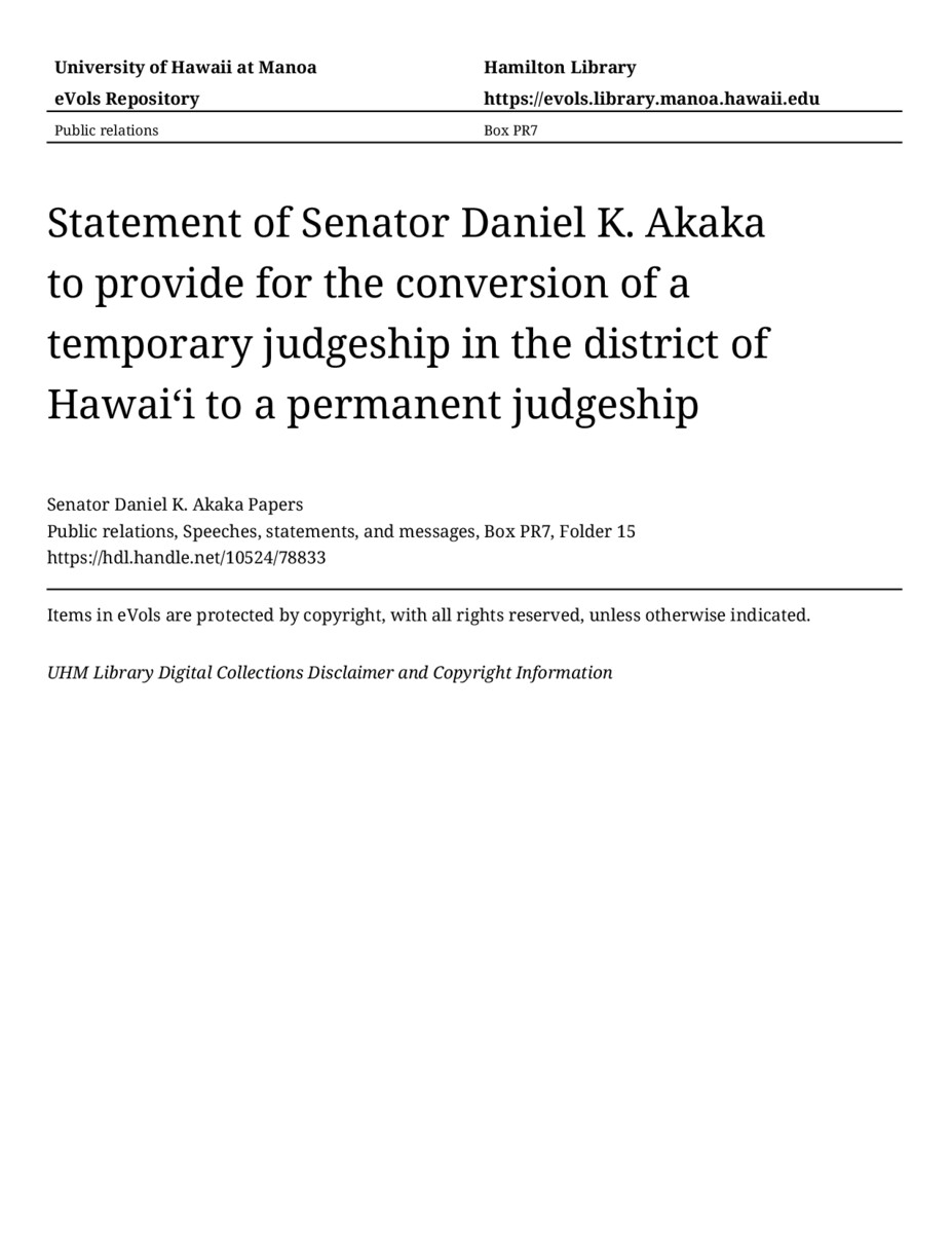 Statement of Senator Daniel K. Akaka to provide for the conversion of a temporary judgeship in the district of Hawaiʻi to a permanent judgeship, May 7, 2007, MANUSCRIPT-HCPC00010, Public relations, Speeches, statements, and messages, Box PR7, Folder 15, Senator Daniel K. Akaka Papers, Hawaiʻi Congressional Papers Collection, University of Hawaiʻi at Mānoa Library, Honolulu, HI. https://omekas-congress.lib.wvu.edu/catalog/10524_78833 (accessed April 17, 2026).