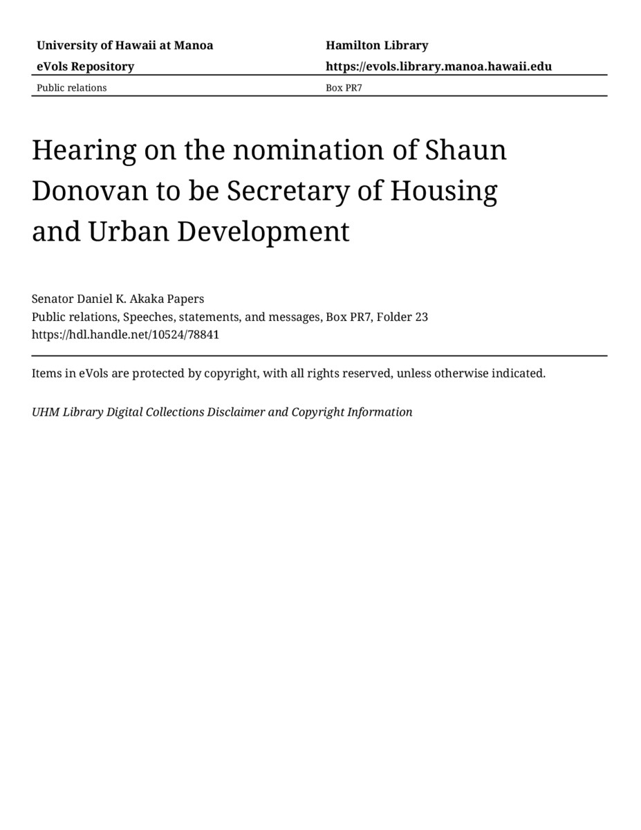 - Hearing on the nomination of Shaun Donovan to be Secretary of Housing and Urban Development