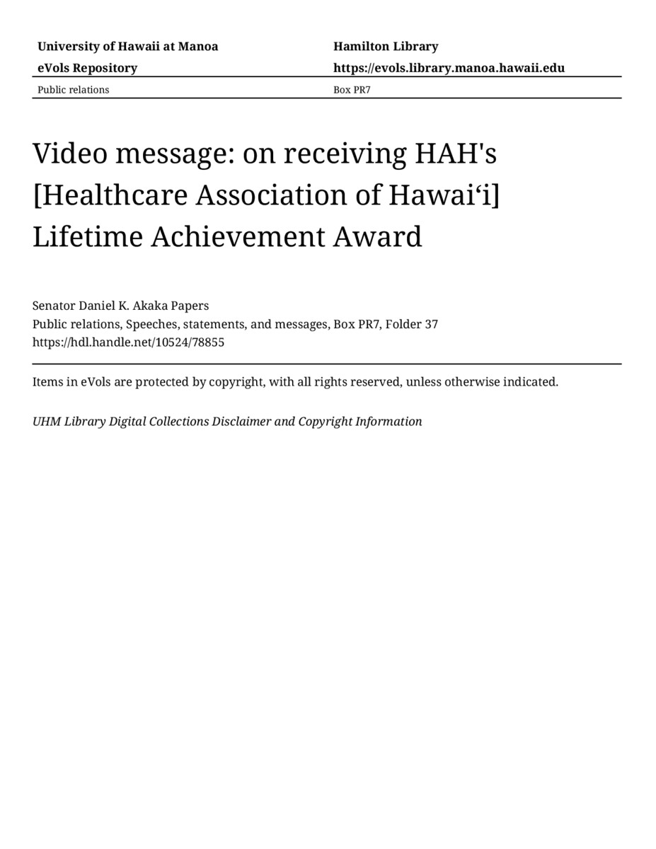 Video message: on receiving HAH's [Healthcare Association of Hawaiʻi] Lifetime Achievement Award