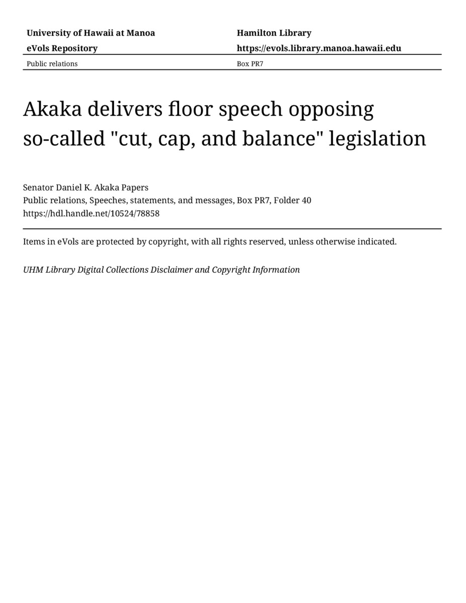 - Akaka delivers floor speech opposing so-called "cut, cap, and balance" legislation