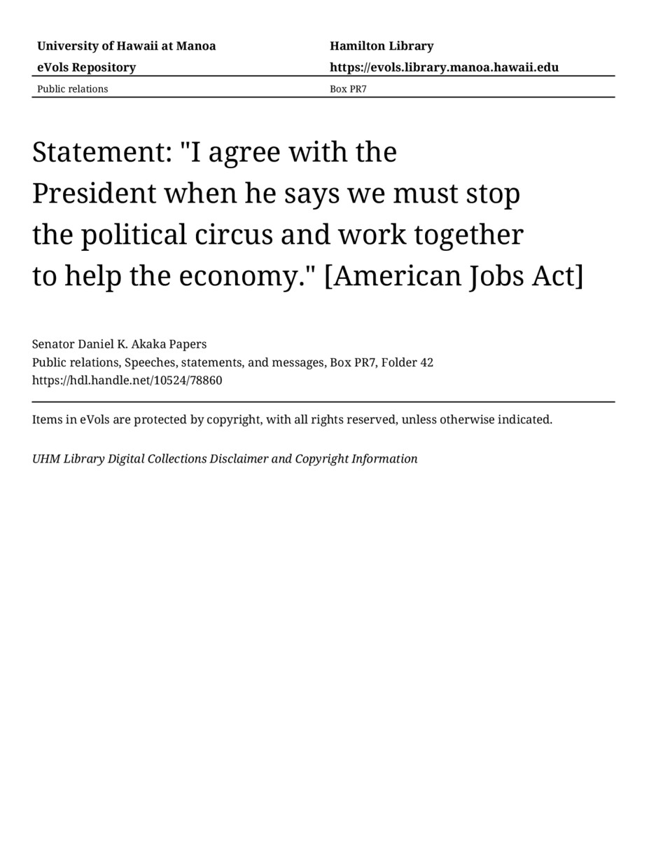 Statement: "I agree with the President when he says we must stop the political circus and work together to help the economy." [American Jobs Act], September 8, 2011, MANUSCRIPT-HCPC00010, Public relations, Speeches, statements, and messages, Box PR7, Folder 42, Senator Daniel K. Akaka Papers, Hawaiʻi Congressional Papers Collection, University of Hawaiʻi at Mānoa Library, Honolulu, HI. https://omekas-congress.lib.wvu.edu/catalog/10524_78860 (accessed April 20, 2026).