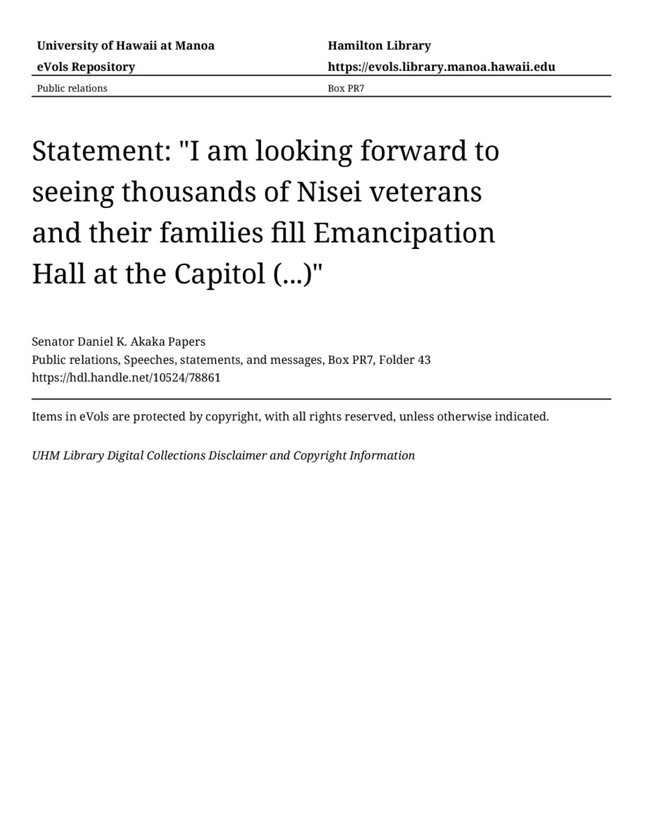 Statement: "I am looking forward to seeing thousands of Nisei veterans and their families fill Emancipation Hall at the Capitol (...)", approximately 2011, MANUSCRIPT-HCPC00010, Public relations, Speeches, statements, and messages, Box PR7, Folder 43, Senator Daniel K. Akaka Papers, Hawaiʻi Congressional Papers Collection, University of Hawaiʻi at Mānoa Library, Honolulu, HI. https://omekas-congress.lib.wvu.edu/catalog/10524_78861 (accessed April 20, 2026).