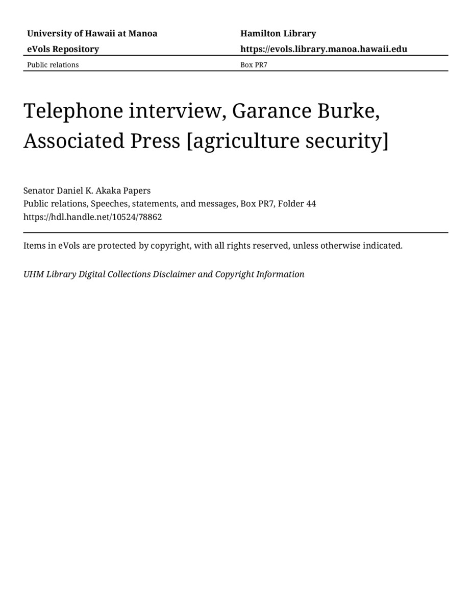 - Telephone interview, Garance Burke, Associated Press [agriculture security]