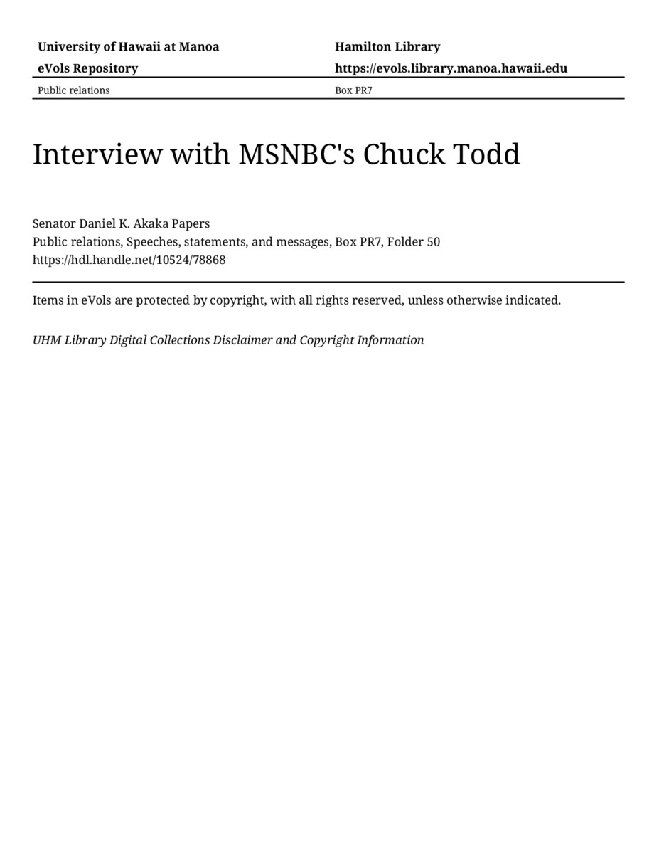 Interview with MSNBC's Chuck Todd, July 27, 2012, MANUSCRIPT-HCPC00010, Public relations, Speeches, statements, and messages, Box PR7, Folder 50, Senator Daniel K. Akaka Papers, Hawaiʻi Congressional Papers Collection, University of Hawaiʻi at Mānoa Library, Honolulu, HI. https://omekas-congress.lib.wvu.edu/catalog/10524_78868 (accessed April 10, 2026).