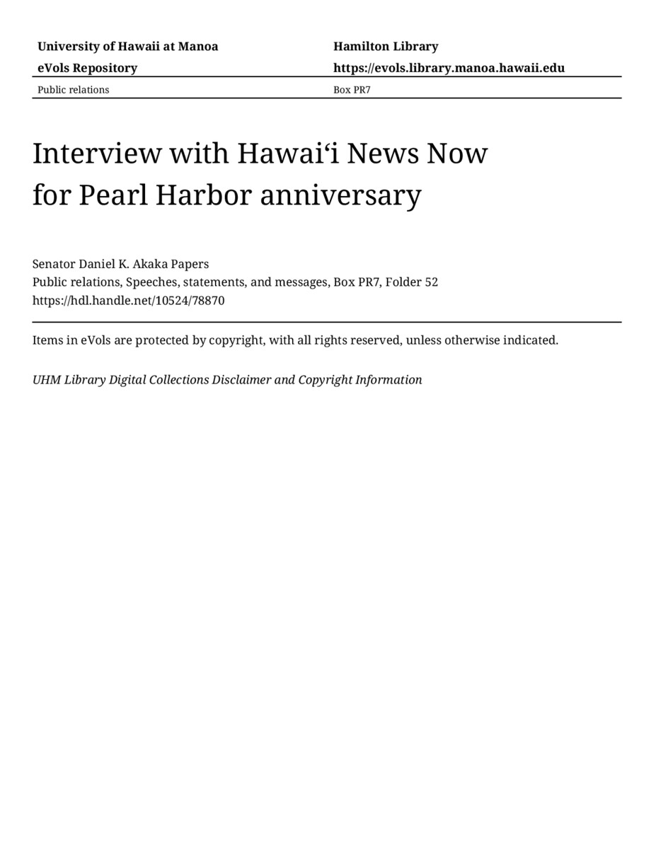 Interview with Hawaiʻi News Now for Pearl Harbor anniversary, September 6, 2012, MANUSCRIPT-HCPC00010, Public relations, Speeches, statements, and messages, Box PR7, Folder 52, Senator Daniel K. Akaka Papers, Hawaiʻi Congressional Papers Collection, University of Hawaiʻi at Mānoa Library, Honolulu, HI. https://omekas-congress.lib.wvu.edu/catalog/10524_78870 (accessed April 10, 2026).