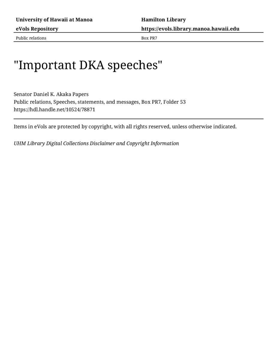 "Important DKA speeches", 1993-1999, MANUSCRIPT-HCPC00010, Public relations, Speeches, statements, and messages, Box PR7, Folder 53, Senator Daniel K. Akaka Papers, Hawaiʻi Congressional Papers Collection, University of Hawaiʻi at Mānoa Library, Honolulu, HI. https://omekas-congress.lib.wvu.edu/catalog/10524_78871 (accessed April 15, 2026).