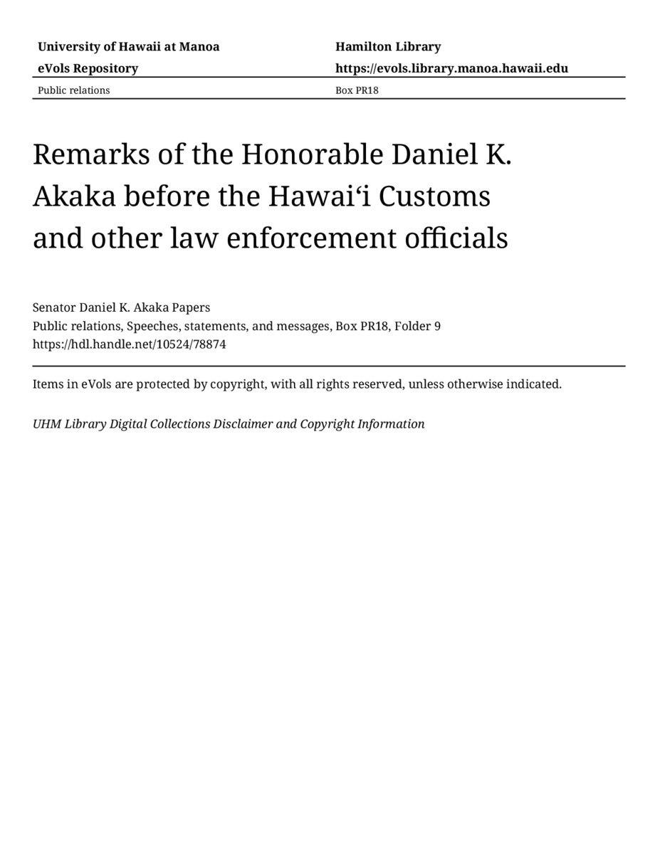 - Remarks of the Honorable Daniel K. Akaka before the Hawaiʻi Customs and other law enforcement officials