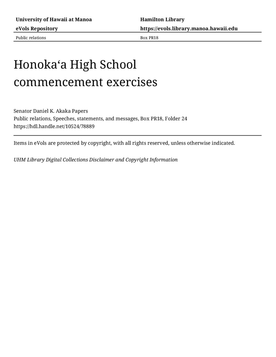 Honokaʻa High School commencement exercises, June 2, 1990, MANUSCRIPT-HCPC00010, Public relations, Speeches, statements, and messages, Box PR18, Folder 24, Senator Daniel K. Akaka Papers, Hawaiʻi Congressional Papers Collection, University of Hawaiʻi at Mānoa Library, Honolulu, HI. https://omekas-congress.lib.wvu.edu/catalog/10524_78889 (accessed April 19, 2026).