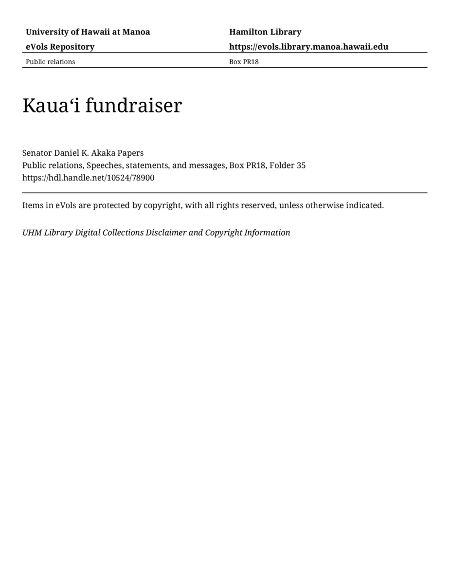 Kauaʻi fundraiser, August 31, 1990, MANUSCRIPT-HCPC00010, Public relations, Speeches, statements, and messages, Box PR18, Folder 35, Senator Daniel K. Akaka Papers, Hawaiʻi Congressional Papers Collection, University of Hawaiʻi at Mānoa Library, Honolulu, HI. https://omekas-congress.lib.wvu.edu/catalog/10524_78900 (accessed April 18, 2026).