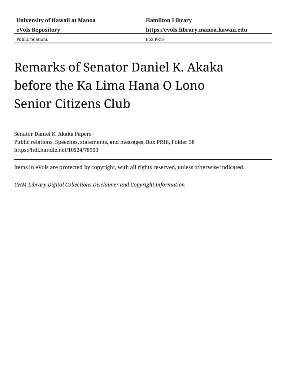 - Remarks of Senator Daniel K. Akaka before the Ka Lima Hana O Lono Senior Citizens Club