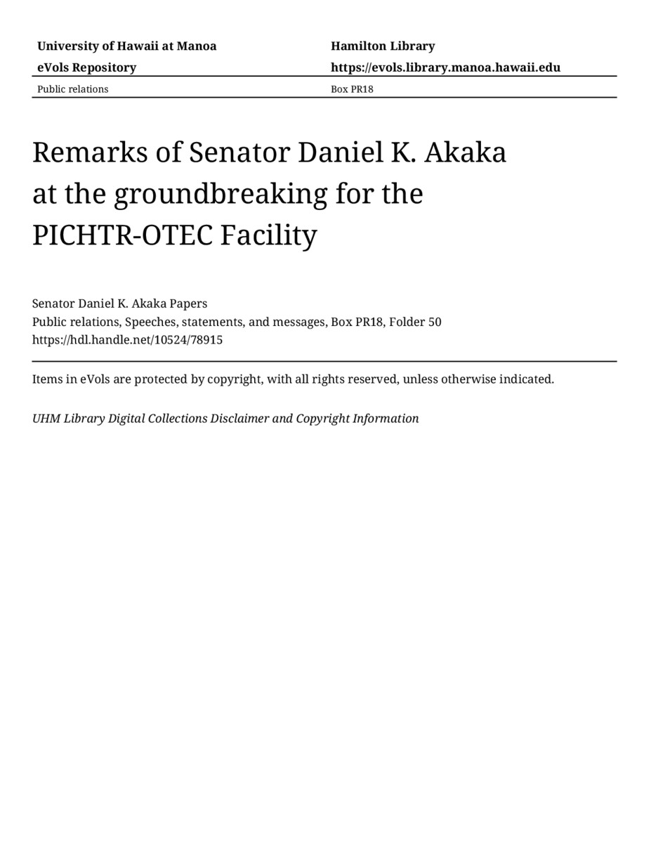 - Remarks of Senator Daniel K. Akaka at the groundbreaking for the PICHTR-OTEC Facility