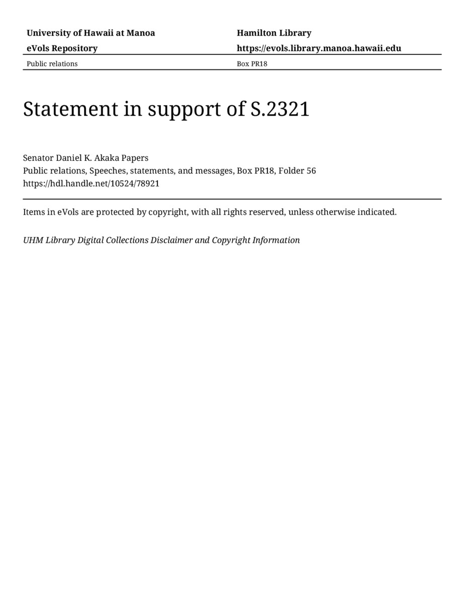 Statement in support of S.2321, May 14, 1992, MANUSCRIPT-HCPC00010, Public relations, Speeches, statements, and messages, Box PR18, Folder 56, Senator Daniel K. Akaka Papers, Hawaiʻi Congressional Papers Collection, University of Hawaiʻi at Mānoa Library, Honolulu, HI. https://omekas-congress.lib.wvu.edu/catalog/10524_78921 (accessed April 23, 2026).