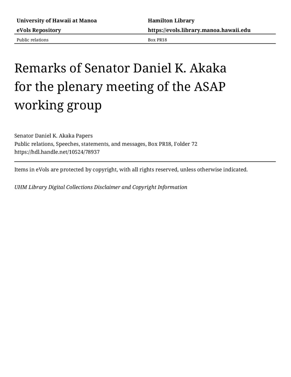 - Remarks of Senator Daniel K. Akaka for the plenary meeting of the ASAP working group