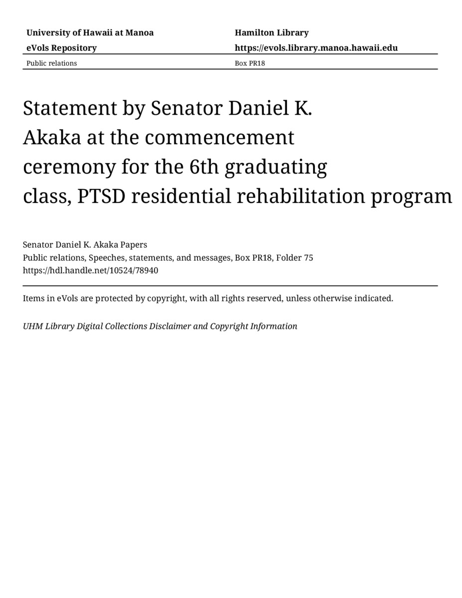 Statement by Senator Daniel K. Akaka at the commencement ceremony for the 6th graduating class, PTSD residential rehabilitation program, December 14, 1994, MANUSCRIPT-HCPC00010, Public relations, Speeches, statements, and messages, Box PR18, Folder 75, Senator Daniel K. Akaka Papers, Hawaiʻi Congressional Papers Collection, University of Hawaiʻi at Mānoa Library, Honolulu, HI. https://omekas-congress.lib.wvu.edu/catalog/10524_78940 (accessed April 17, 2026).