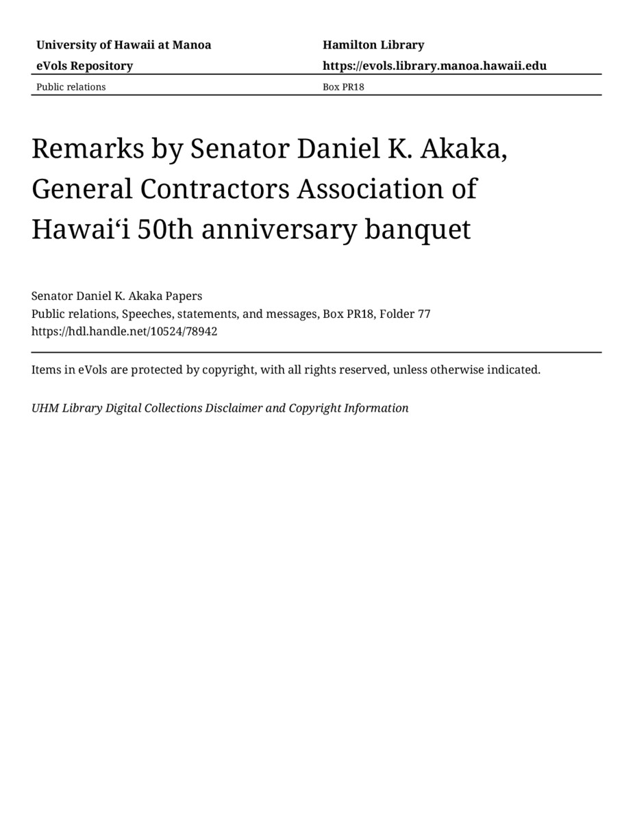 - Remarks by Senator Daniel K. Akaka, General Contractors Association of Hawaiʻi 50th anniversary banquet