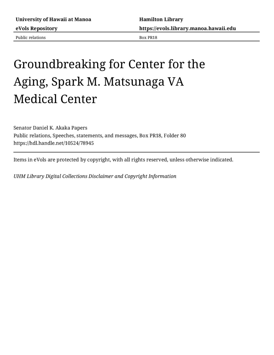 - Groundbreaking for Center for the Aging, Spark M. Matsunaga VA Medical Center