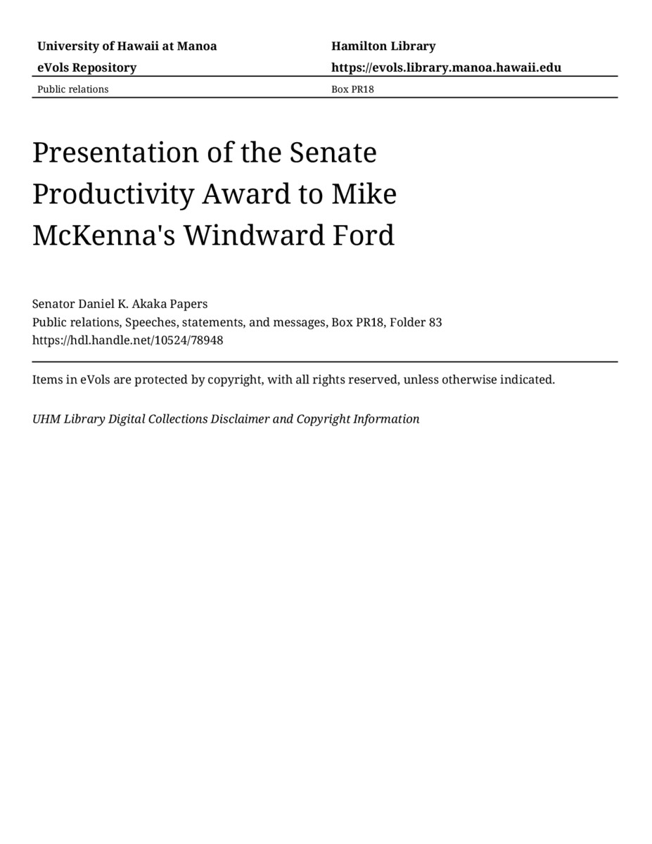 - Presentation of the Senate Productivity Award to Mike McKenna's Windward Ford