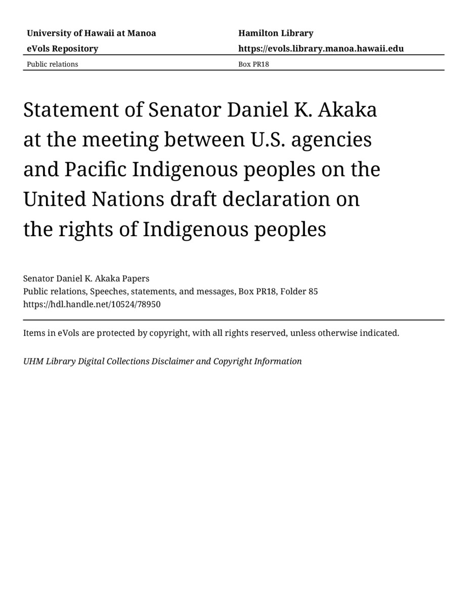 Statement of Senator Daniel K. Akaka at the meeting between U.S. agencies and Pacific Indigenous peoples on the United Nations draft declaration on the rights of Indigenous peoples, August 21, 1996, MANUSCRIPT-HCPC00010, Public relations, Speeches, statements, and messages, Box PR18, Folder 85, Senator Daniel K. Akaka Papers, Hawaiʻi Congressional Papers Collection, University of Hawaiʻi at Mānoa Library, Honolulu, HI. https://omekas-congress.lib.wvu.edu/catalog/10524_78950 (accessed April 16, 2026).
