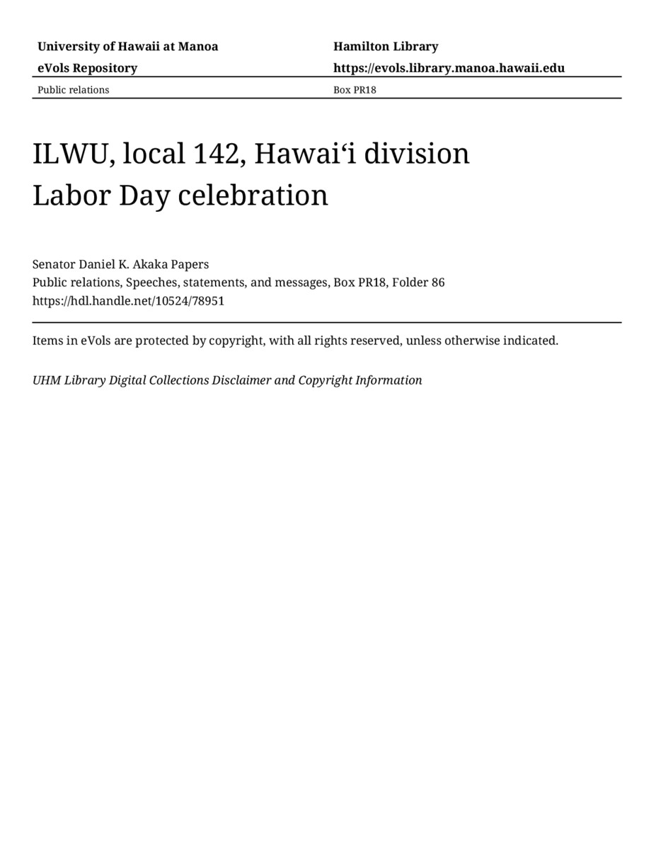 ILWU, local 142, Hawaiʻi division Labor Day celebration, August 24, 1996, MANUSCRIPT-HCPC00010, Public relations, Speeches, statements, and messages, Box PR18, Folder 86, Senator Daniel K. Akaka Papers, Hawaiʻi Congressional Papers Collection, University of Hawaiʻi at Mānoa Library, Honolulu, HI. https://omekas-congress.lib.wvu.edu/catalog/10524_78951 (accessed April 18, 2026).