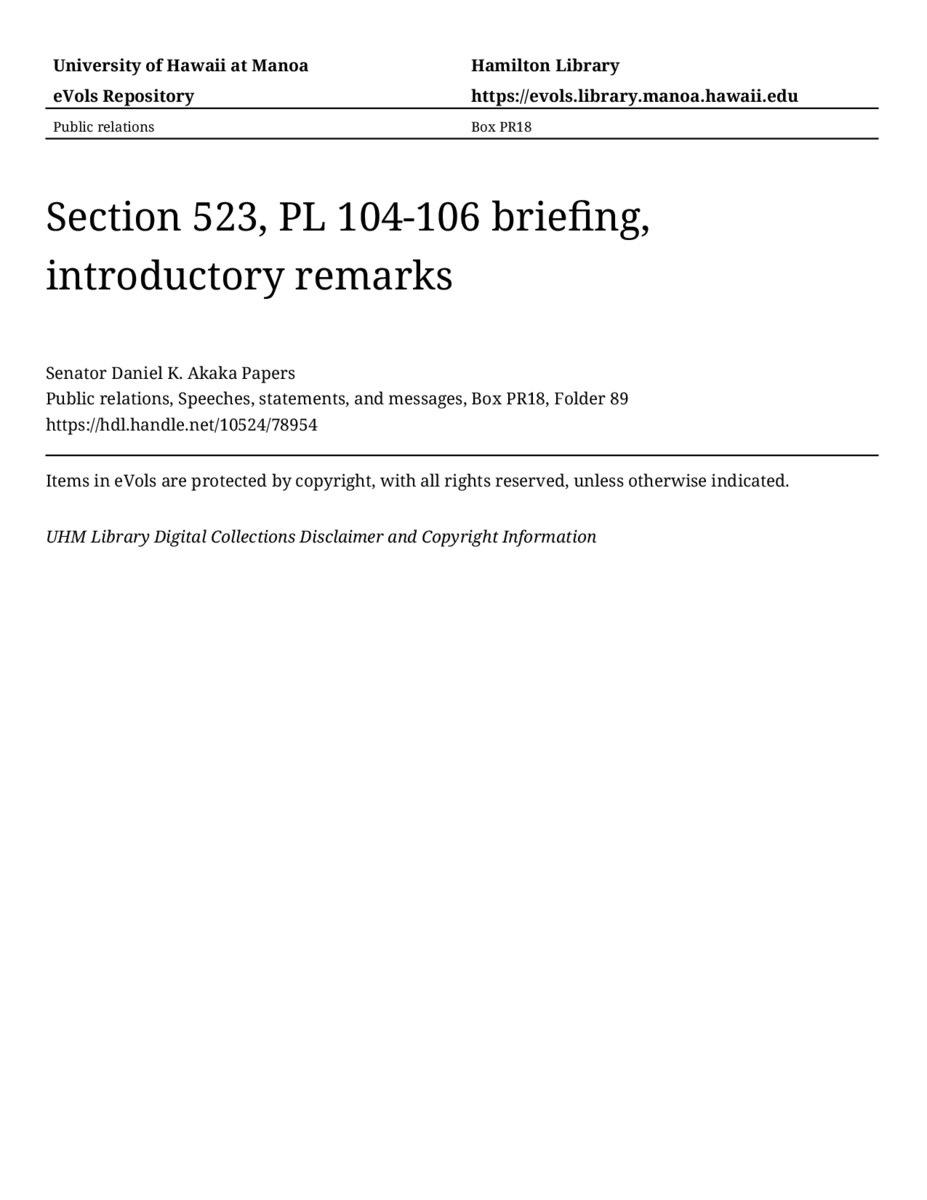 Section 523, PL 104-106 briefing, introductory remarks, October 16, 1996, MANUSCRIPT-HCPC00010, Public relations, Speeches, statements, and messages, Box PR18, Folder 89, Senator Daniel K. Akaka Papers, Hawaiʻi Congressional Papers Collection, University of Hawaiʻi at Mānoa Library, Honolulu, HI. https://omekas-congress.lib.wvu.edu/catalog/10524_78954 (accessed April 20, 2026).