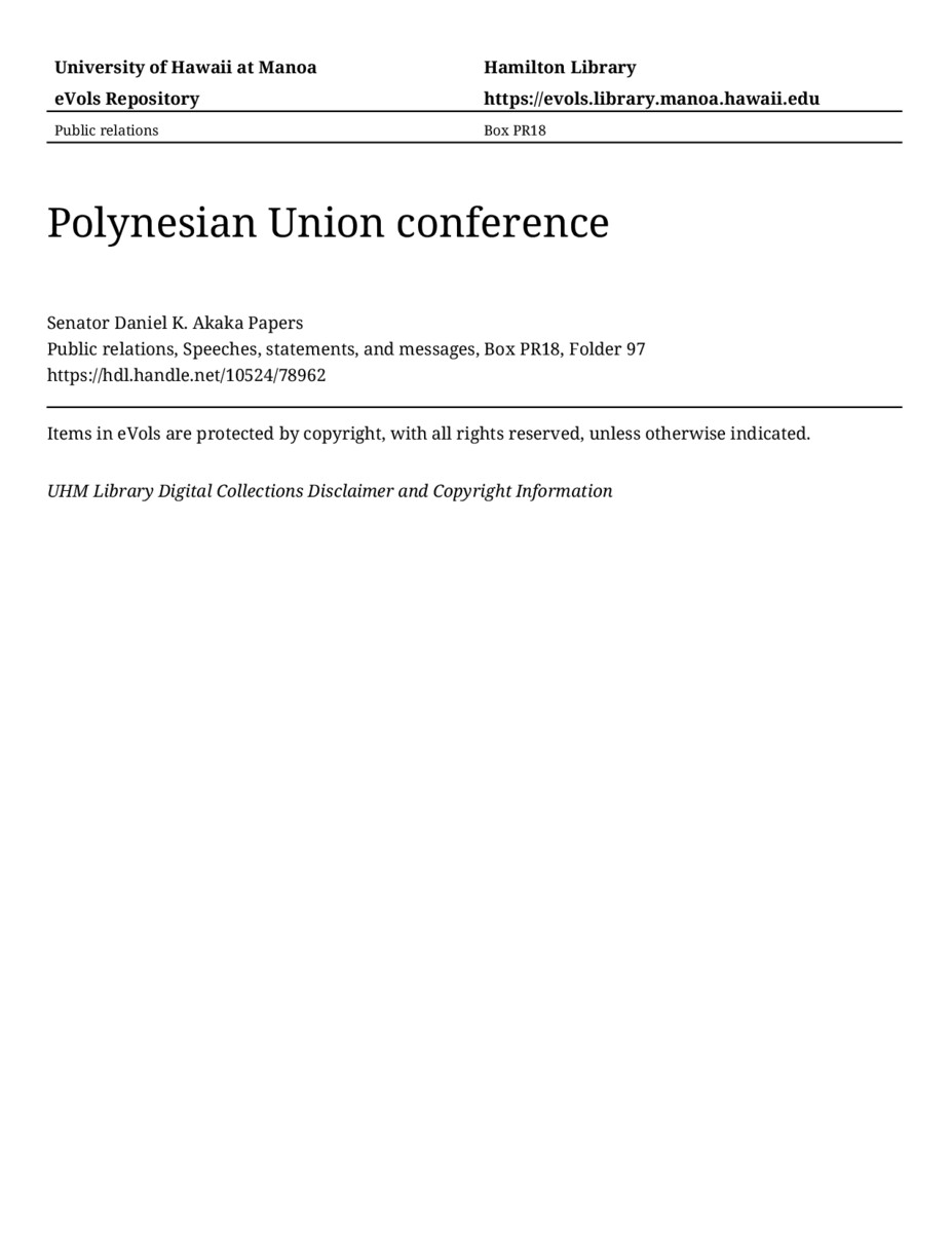 Polynesian Union conference, February 15, 1997, MANUSCRIPT-HCPC00010, Public relations, Speeches, statements, and messages, Box PR18, Folder 97, Senator Daniel K. Akaka Papers, Hawaiʻi Congressional Papers Collection, University of Hawaiʻi at Mānoa Library, Honolulu, HI. https://omekas-congress.lib.wvu.edu/catalog/10524_78962 (accessed April 19, 2026).