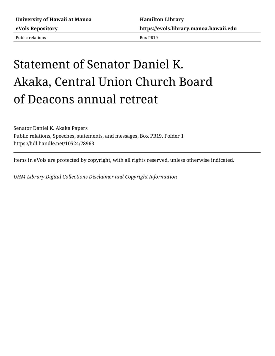 Statement of Senator Daniel K. Akaka, Central Union Church Board of Deacons annual retreat