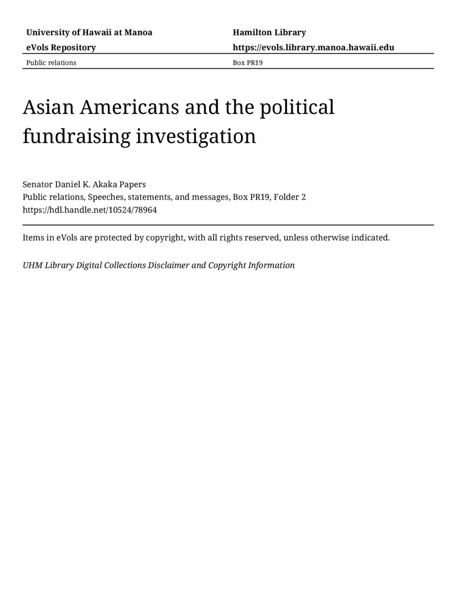Asian Americans and the political fundraising investigation, March 20, 1997, MANUSCRIPT-HCPC00010, Public relations, Speeches, statements, and messages, Box PR19, Folder 2, Senator Daniel K. Akaka Papers, Hawaiʻi Congressional Papers Collection, University of Hawaiʻi at Mānoa Library, Honolulu, HI. https://omekas-congress.lib.wvu.edu/catalog/10524_78964 (accessed April 18, 2026).