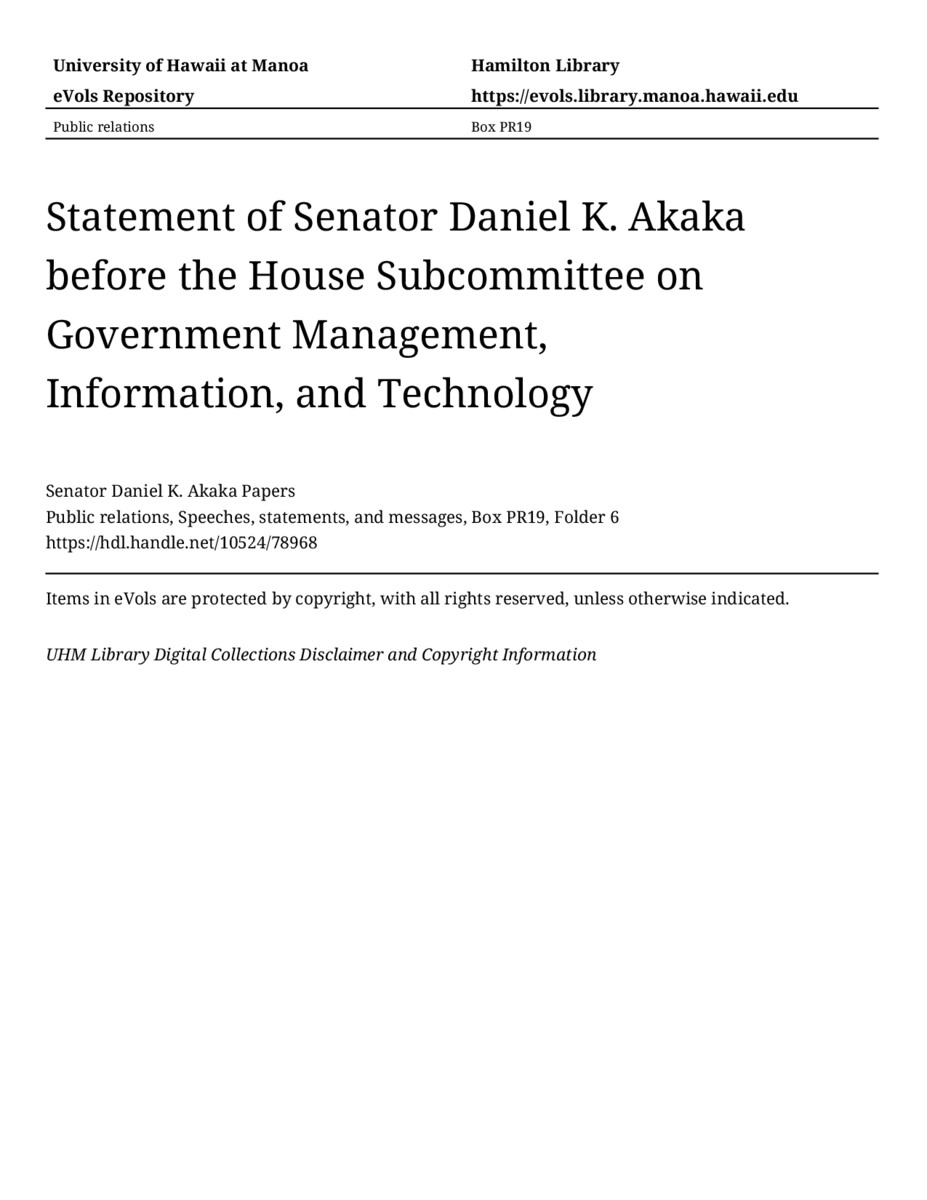 Statement of Senator Daniel K. Akaka before the House Subcommittee on Government Management, Information, and Technology, May 22, 1997, MANUSCRIPT-HCPC00010, Public relations, Speeches, statements, and messages, Box PR19, Folder 6, Senator Daniel K. Akaka Papers, Hawaiʻi Congressional Papers Collection, University of Hawaiʻi at Mānoa Library, Honolulu, HI. https://omekas-congress.lib.wvu.edu/catalog/10524_78968 (accessed April 16, 2026).