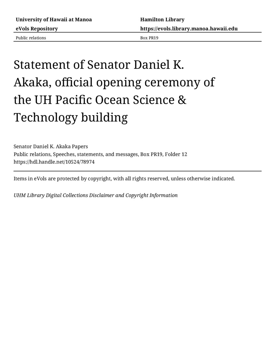 Statement of Senator Daniel K. Akaka, official opening ceremony of the UH Pacific Ocean Science & Technology building, July 2, 1997, MANUSCRIPT-HCPC00010, Public relations, Speeches, statements, and messages, Box PR19, Folder 12, Senator Daniel K. Akaka Papers, Hawaiʻi Congressional Papers Collection, University of Hawaiʻi at Mānoa Library, Honolulu, HI. https://omekas-congress.lib.wvu.edu/catalog/10524_78974 (accessed April 09, 2026).