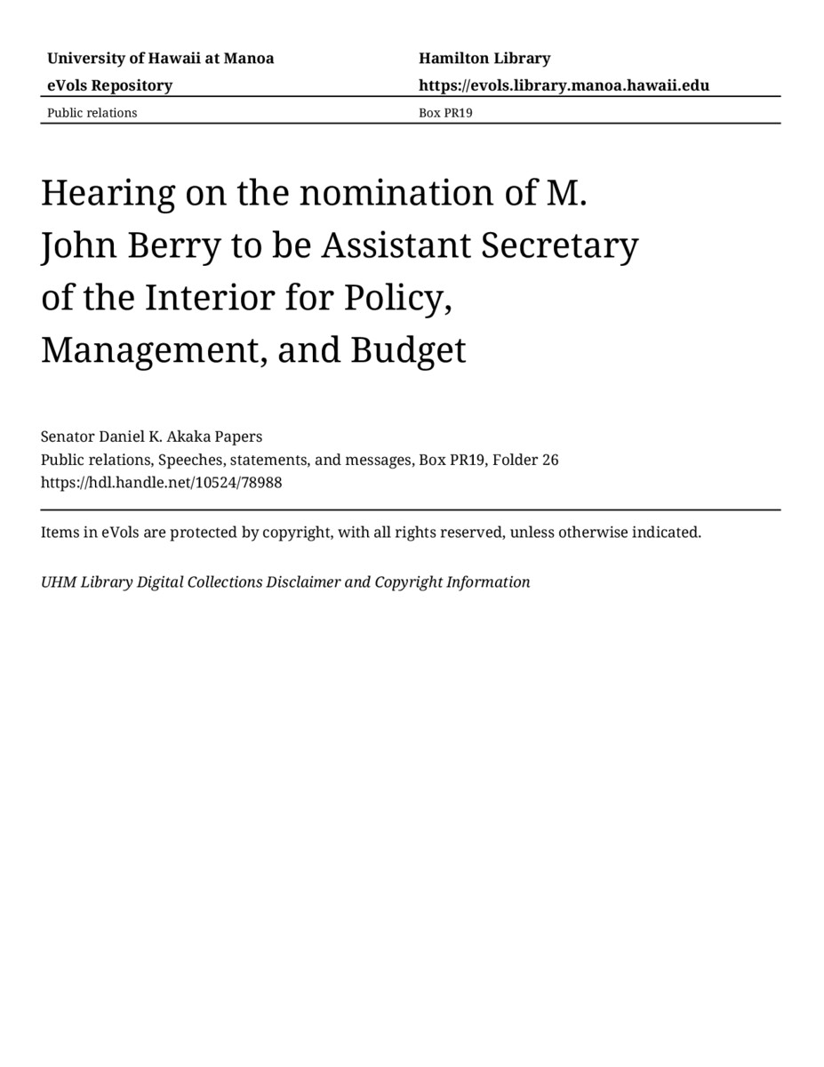 Hearing on the nomination of M. John Berry to be Assistant Secretary of the Interior for Policy, Management, and Budget, October 3, 1997, MANUSCRIPT-HCPC00010, Public relations, Speeches, statements, and messages, Box PR19, Folder 26, Senator Daniel K. Akaka Papers, Hawaiʻi Congressional Papers Collection, University of Hawaiʻi at Mānoa Library, Honolulu, HI. https://omekas-congress.lib.wvu.edu/catalog/10524_78988 (accessed April 18, 2026).