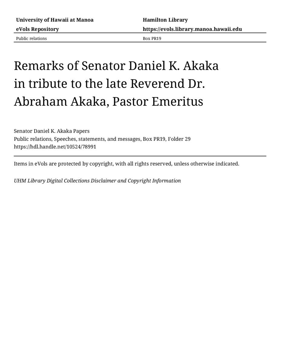 - Remarks of Senator Daniel K. Akaka in tribute to the late Reverend Dr. Abraham Akaka, Pastor Emeritus