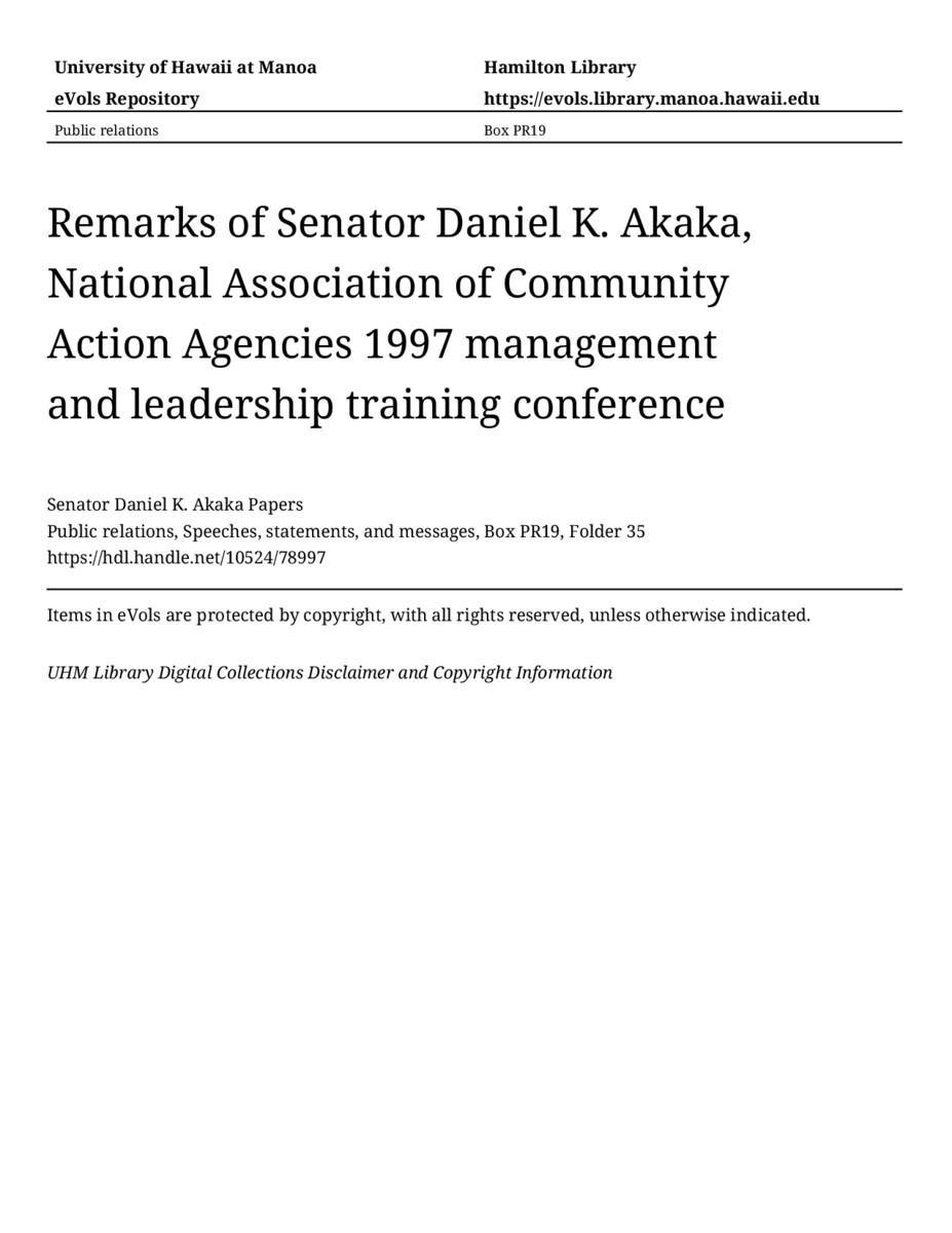 Remarks of Senator Daniel K. Akaka, National Association of Community Action Agencies 1997 management and leadership training conference, December 6, 1997, MANUSCRIPT-HCPC00010, Public relations, Speeches, statements, and messages, Box PR19, Folder 35, Senator Daniel K. Akaka Papers, Hawaiʻi Congressional Papers Collection, University of Hawaiʻi at Mānoa Library, Honolulu, HI. https://omekas-congress.lib.wvu.edu/catalog/10524_78997 (accessed April 20, 2026).