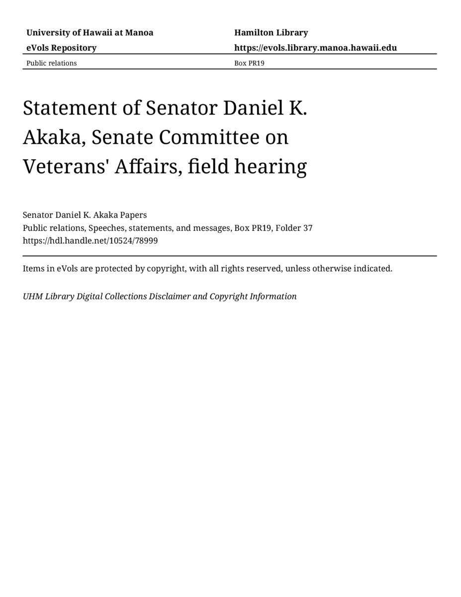 - Statement of Senator Daniel K. Akaka, Senate Committee on Veterans' Affairs, field hearing
