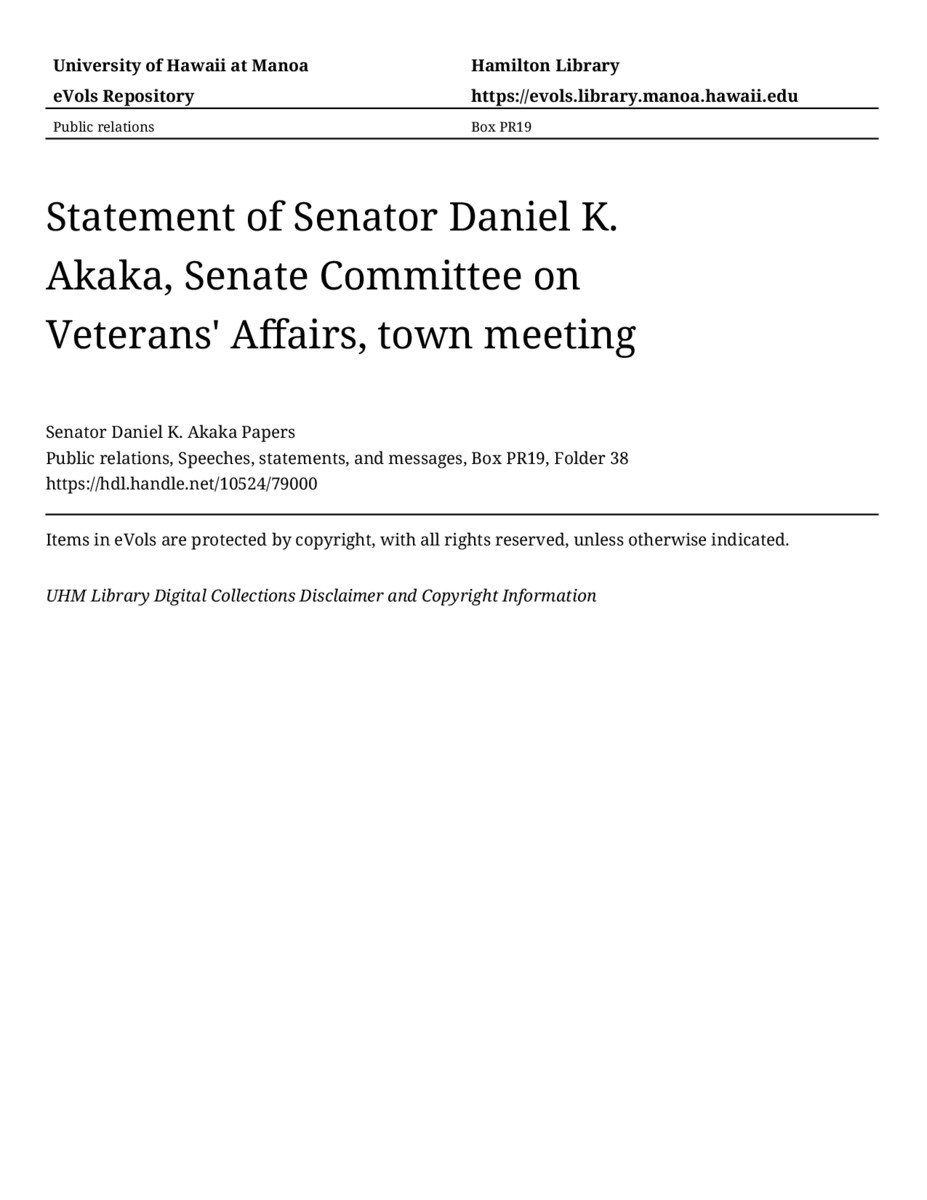 - Statement of Senator Daniel K. Akaka, Senate Committee on Veterans' Affairs, town meeting